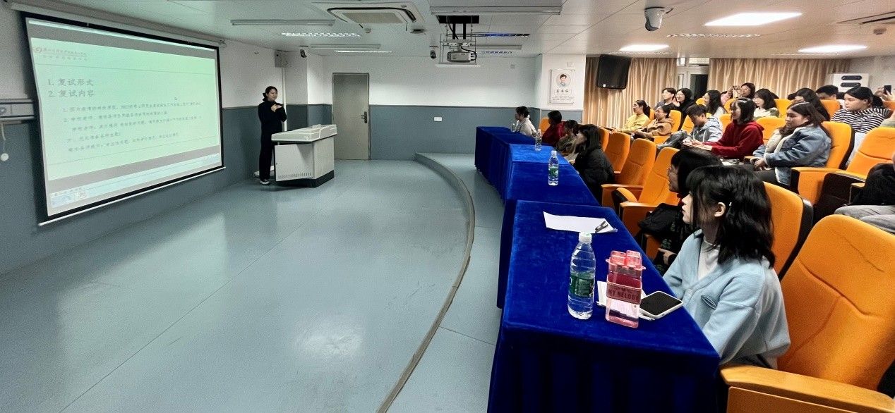 应同学们要求,会议采用“线上+线下”相结合的形式展开。本次交流会由学生办主任欧丽娅教授策划指导,护院本科优秀毕业生2022届高梦昕(在读广医护理研二)、2023届赖美琦(在读广医护理研一)应邀分享,参会的有学院各个年级同学约200人。