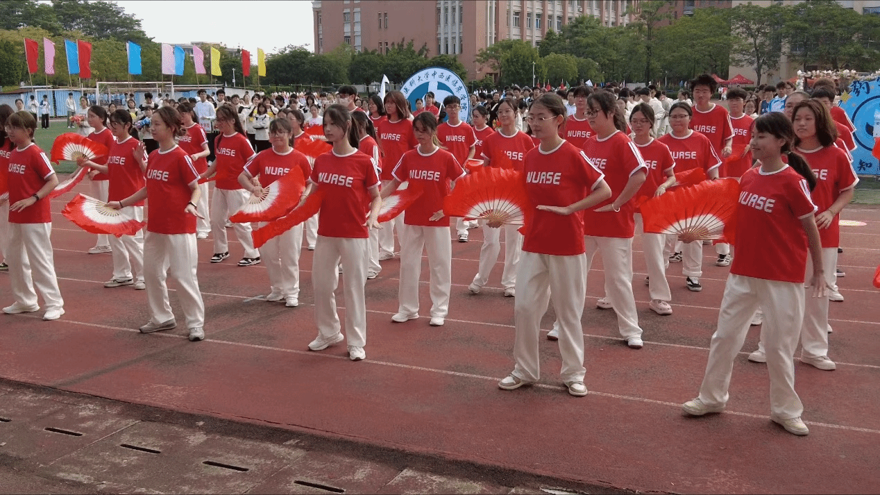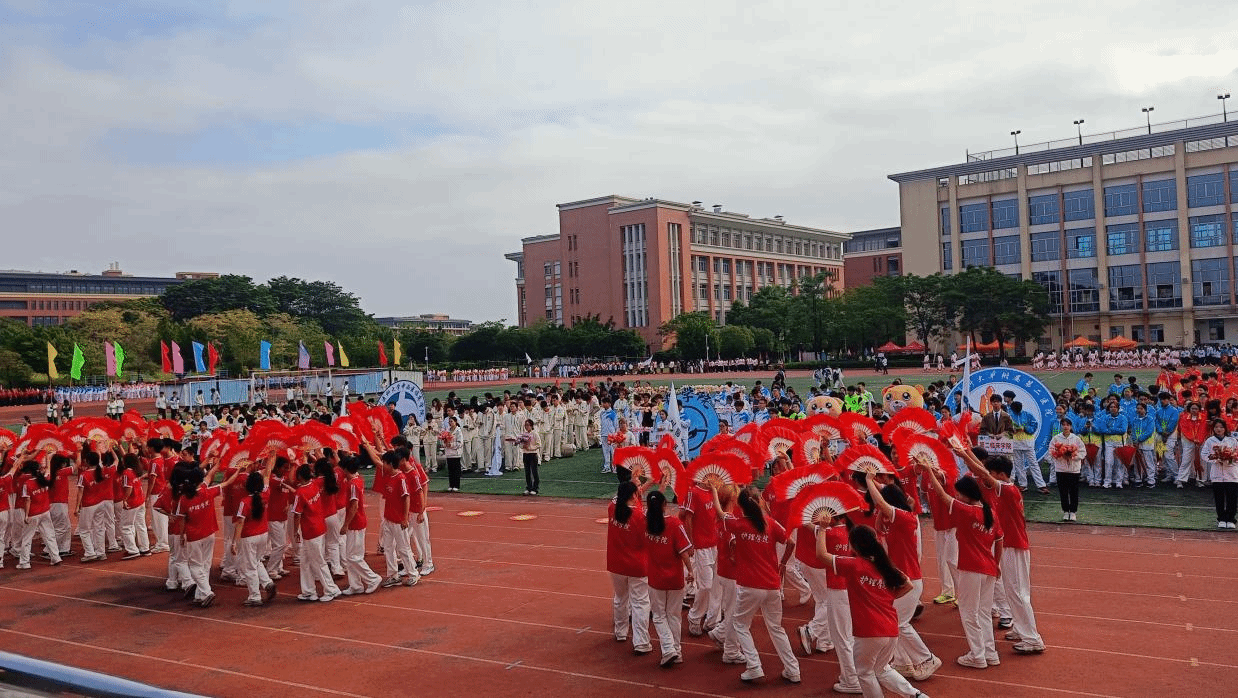 当音乐响起,整齐而满载活力的舞蹈,让同学们成为操场上最靓丽的一道风景线,随着音乐的节奏起起落落,红扇开合之间仿若绽放出一朵朵鲜艳的红花,又似舞动的云霞,为运动会赛场增添了一抹极具中国风的绚丽色彩。