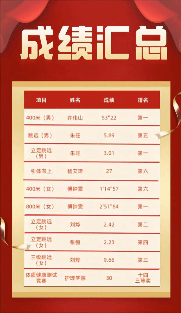 女子800米冠军傅钟雯说:“这个奖对我来说不仅是荣誉,更培养了我坚强的意志品质。以后我会继续加油,争取在更多的赛道上为咱们学院争光!”