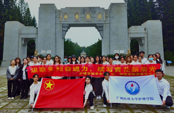 青松掩映间,护理学院学子们手执素菊,以“七十二健儿,酣战春云湛碧血;四百兆国子,愁看秋雨湿黄花”为开始,回望百年前的广州起义,聆听黄花岗起义的悲壮历史。